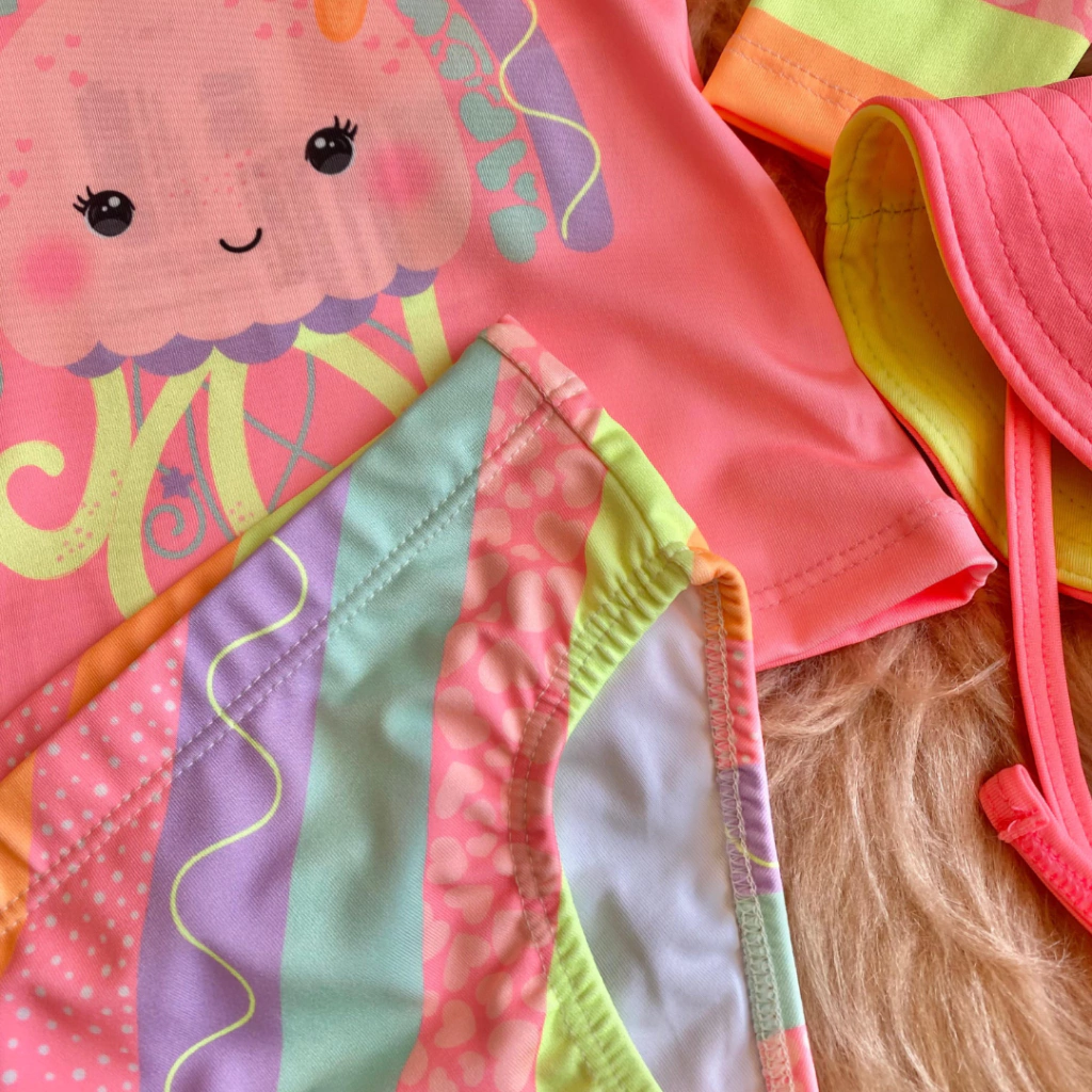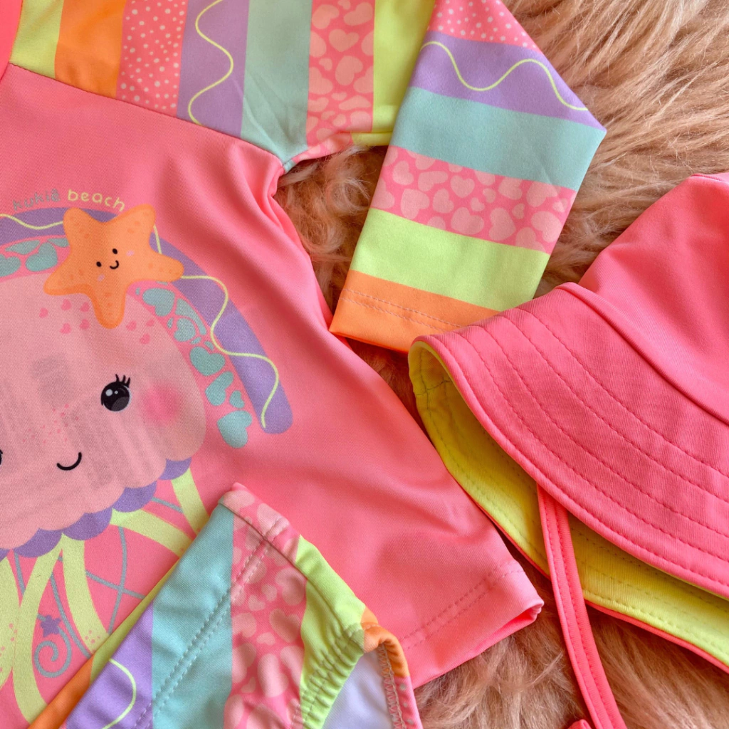 Blusa Manga Longa, Calcinha E Chapéu Rosa Neon Kukiê.