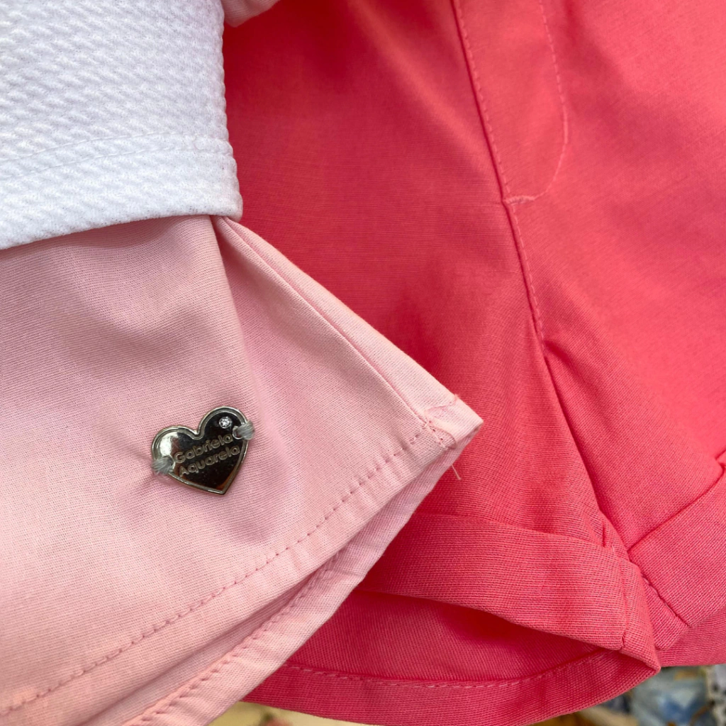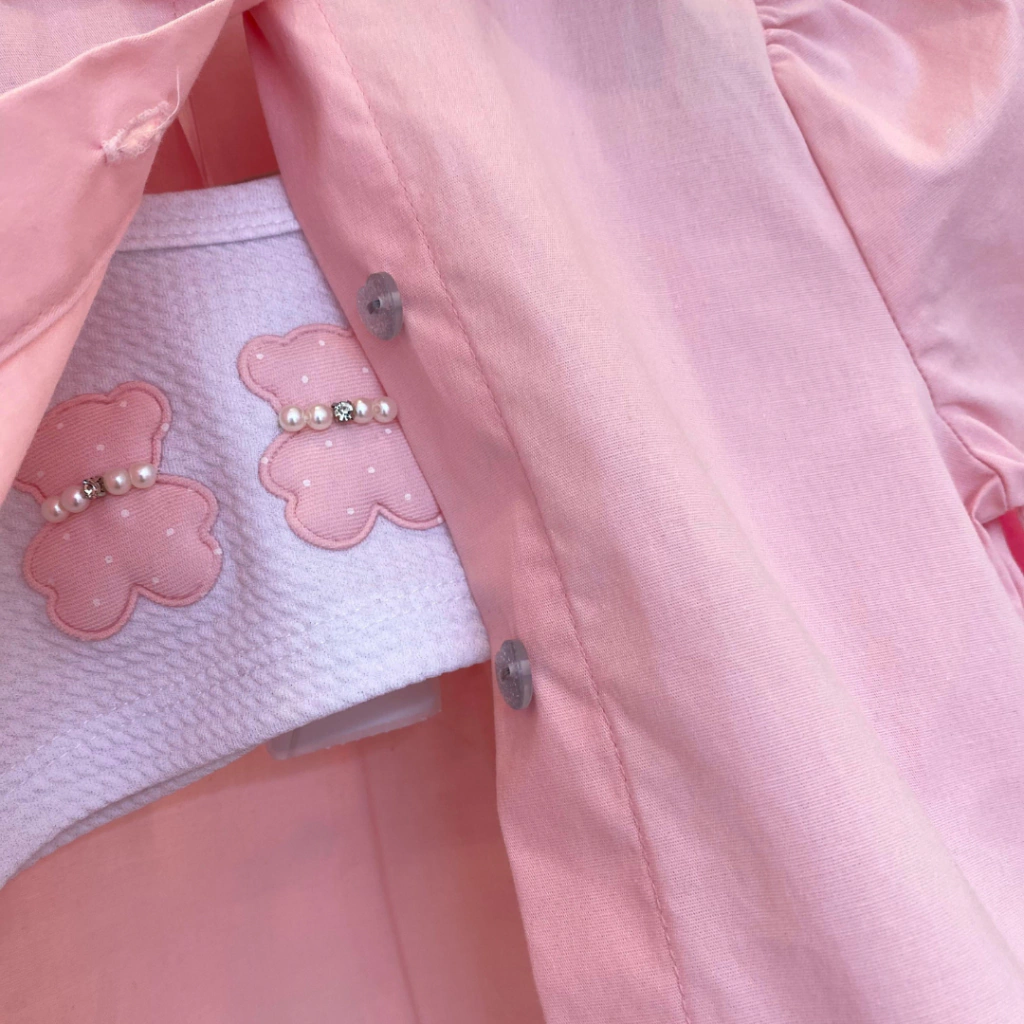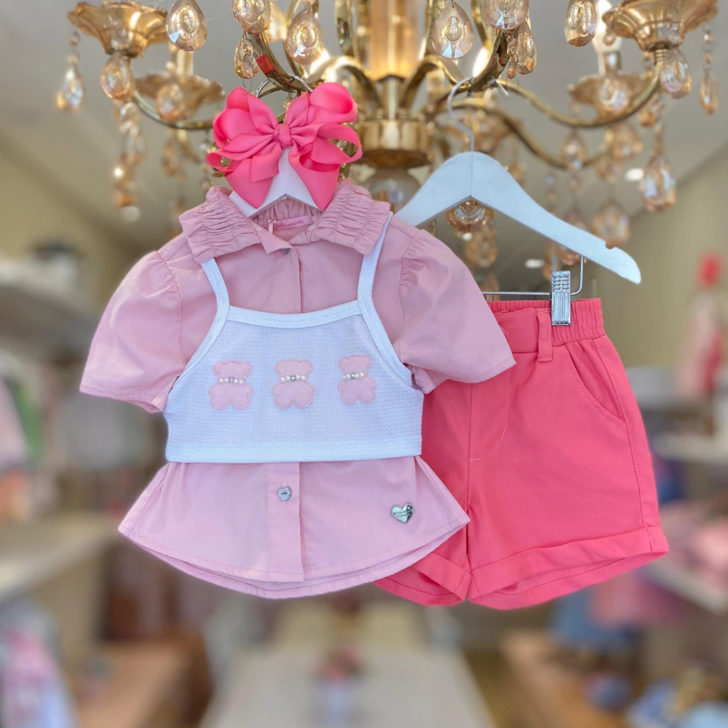 Conjunto 3 Peças Short E Camisa Em Algodão Com Top Ursinhos Rosa Gabriela Aquarela.