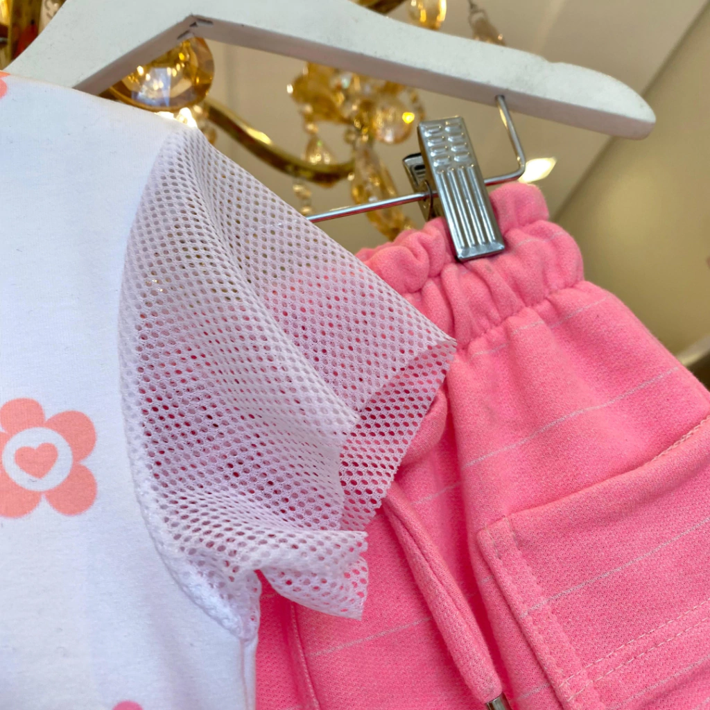 Conjunto Blusa Manga Curta E Short Saia Rosa Neon Kukiê.