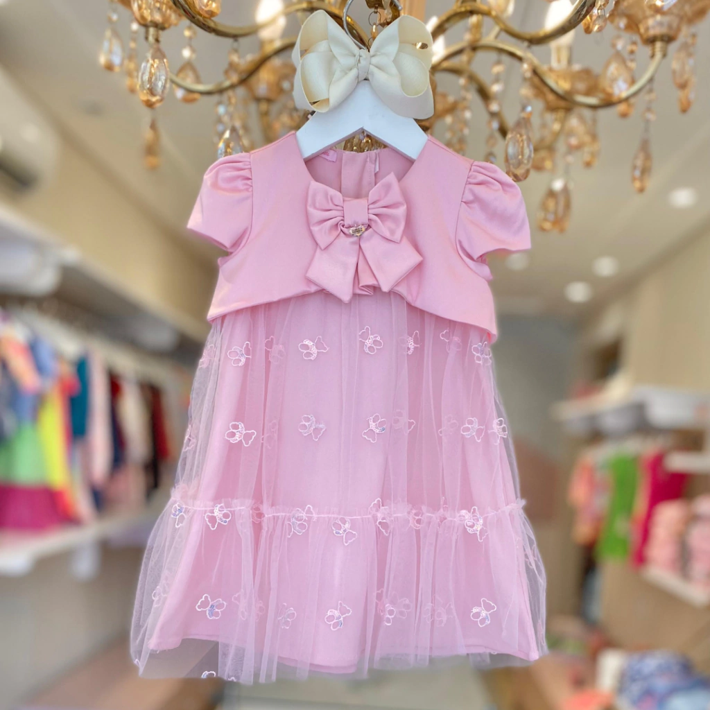 Conjunto Celebrar Vestido Tule Ursinhos Com Falso Bolero Rosa Claro Gabriela Aquarela.