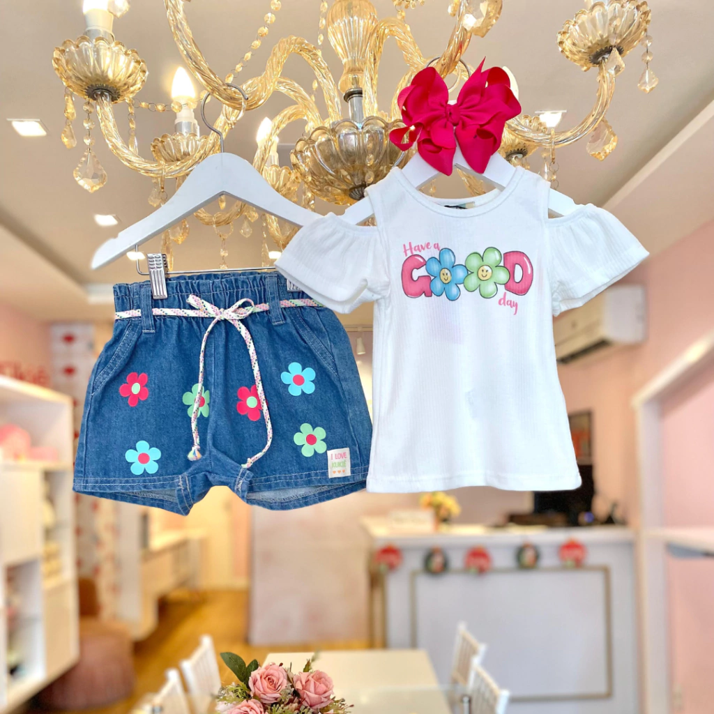 Conjunto De Blusa Em Canelado E Shorts Em Jeans Arkansas Azul Kukiê.