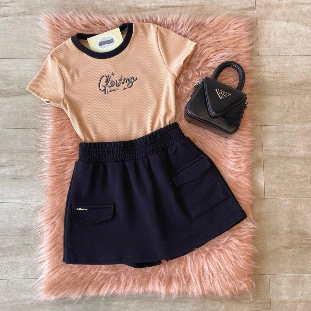 Conjunto Teen de Blusa Cropped em Canelado Fancy e Short Saia em Moletom sem Pelúcia Lilimoon.