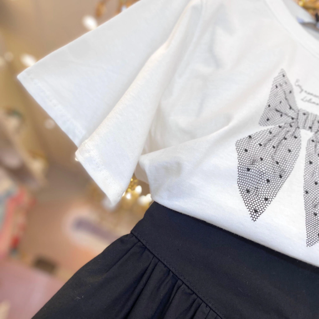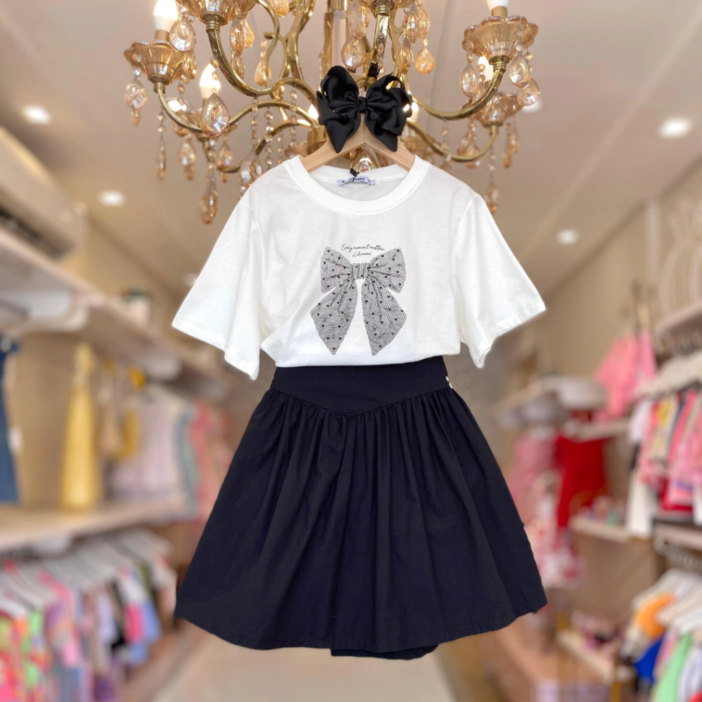 Conjunto Teen de Blusa Over em Meia Malha e Saia em Sarja Empapelada Lilimoon.