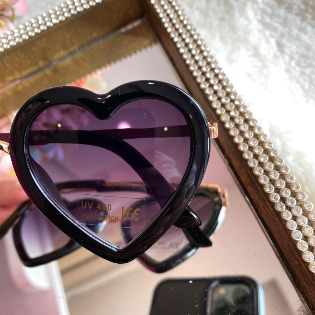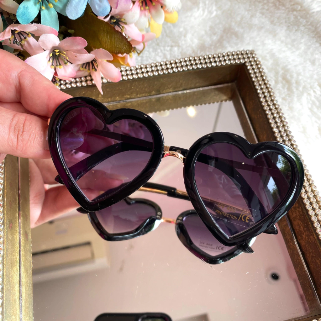 Óculos preto de coração com proteção UV, acompanha caixinha e estojo porta óculos, Kukiê.