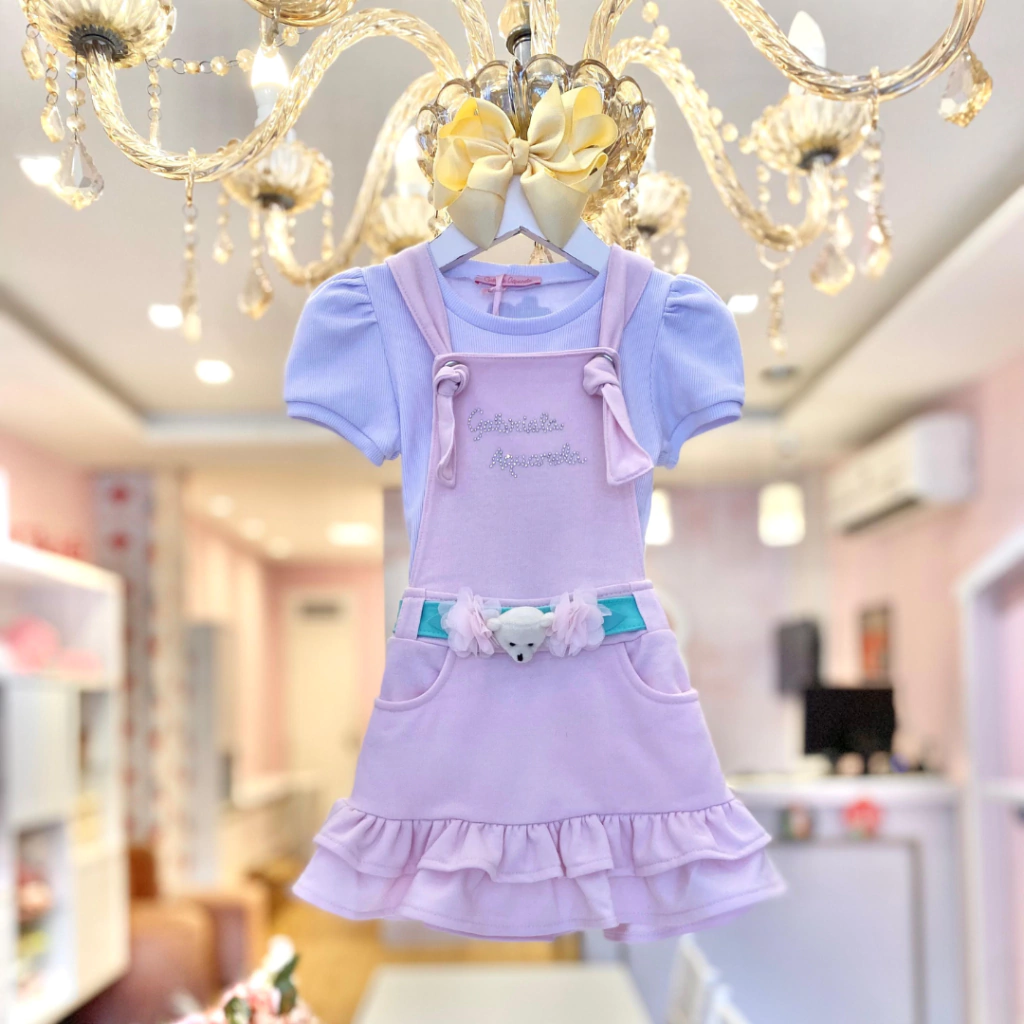 Salopete Rosa Cinto Ursinho E Blusa Branca Rosa Gabriela Aquarela.