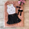 Conjunto Blusa Branca Lacinhos De Cristal Preto e Saia Pregas Jeans Black Gabriela Aquarela